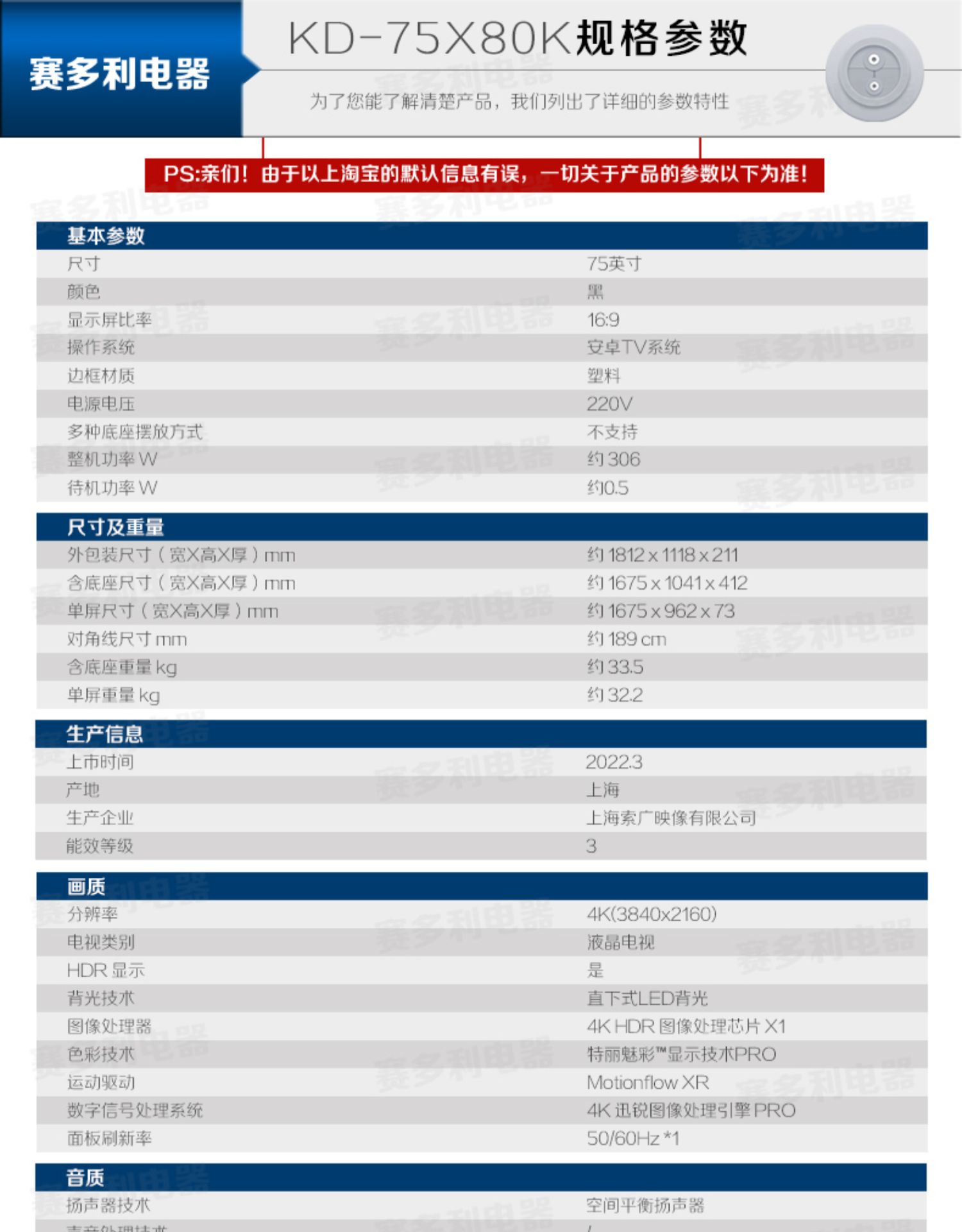 - 商品名称:Sony/索尼 KD-75X80K 75英寸4K HDR 新款安卓智能液晶电视 新款