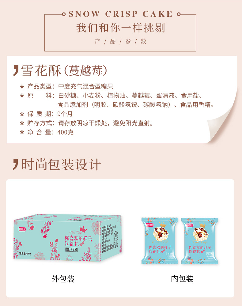 - 商品名称:比比赞网红雪花酥饼干沙琪玛解馋小零食小吃牛轧糖蔓越莓休闲食品